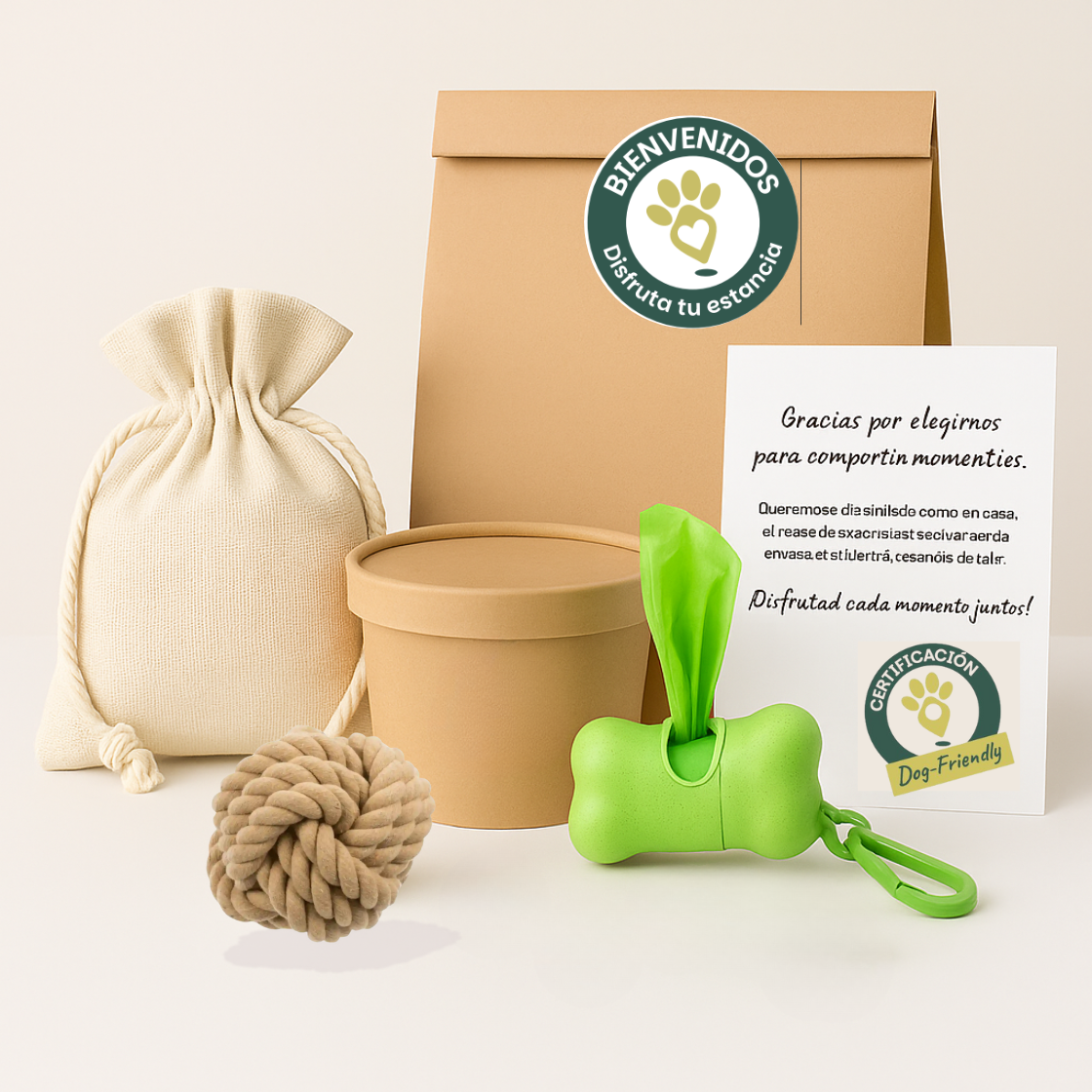 Este Pack ecológico incluye una pelota de cuerda de algodón multicolor y un dispensador de bambú con mosquetón que contiene 15 bolsas biodegradables. Una opción sostenible, ideal para hoteles comprometidos con el cuidado del planeta.